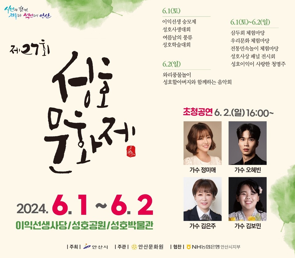 성호문화축제는 올해로 27회를 맞이하며 6월 1일~ 6월 2일 이틀간 개최됩니다.